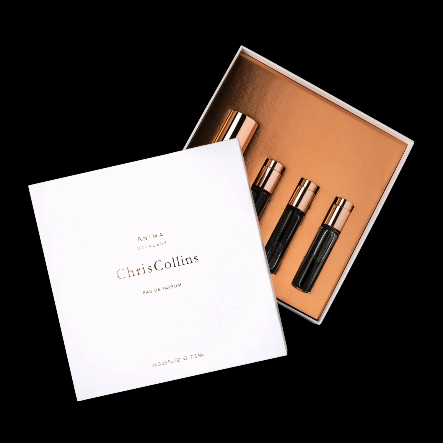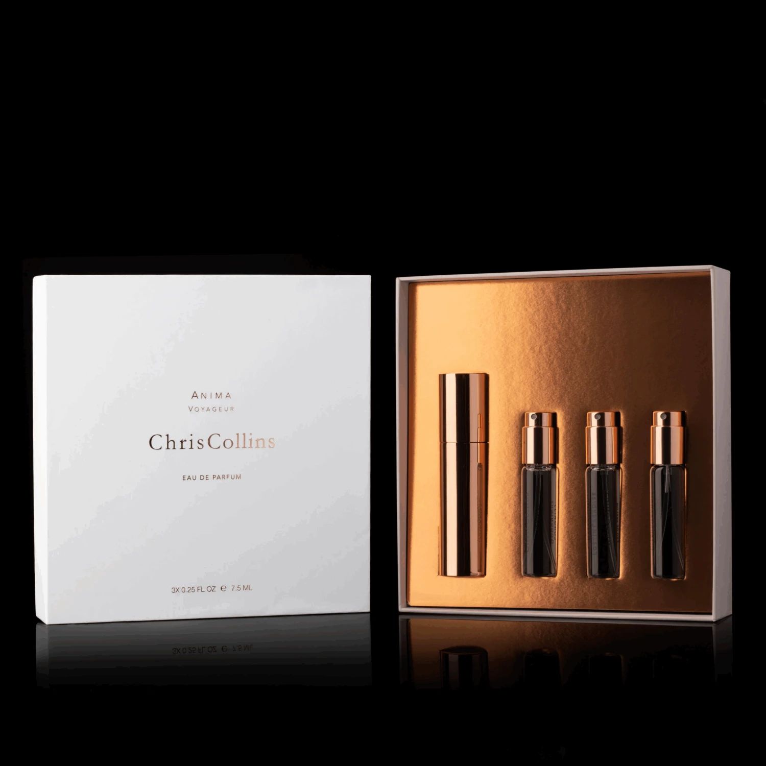 The Chris Collins Anima Voyageur box includes 7.5ml travel sprays of each of the three beautiful fresh fragrances from this collection, plus a sleek metallic reusable travel case. The scents are:
