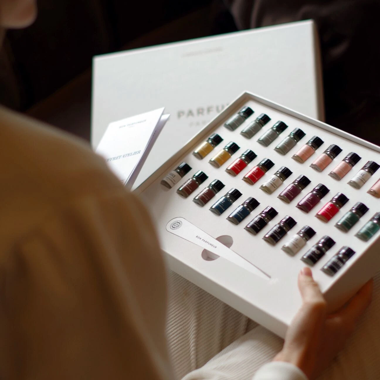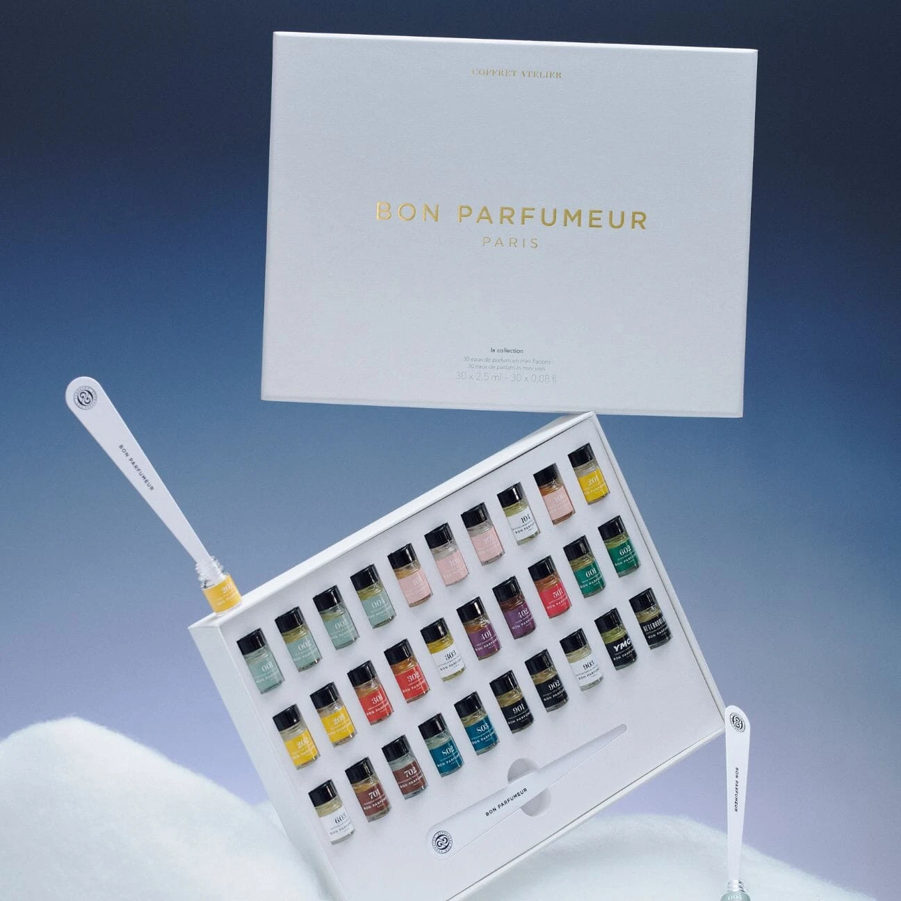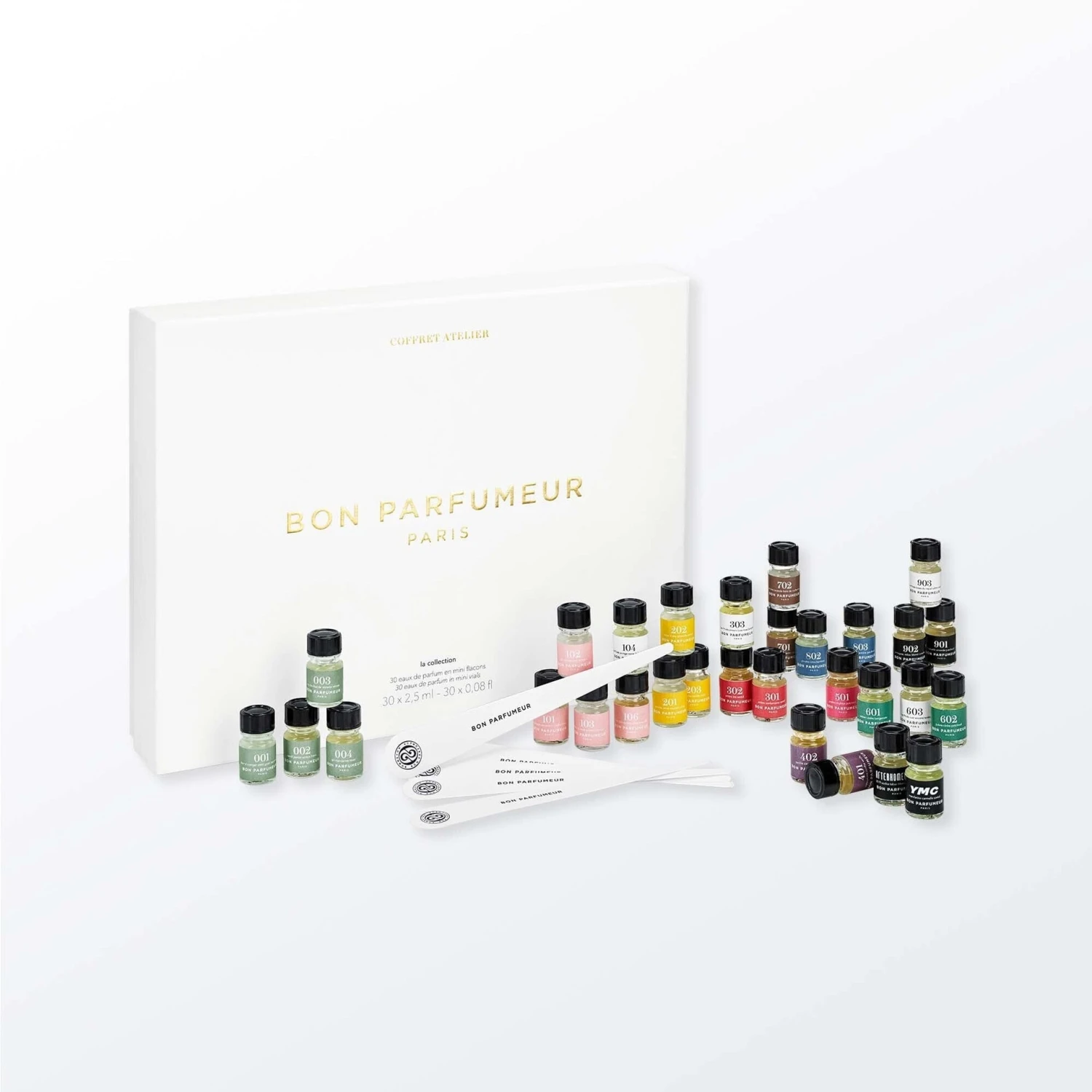 Discover all of Bon Parfumeur’s perfumes with their Atelier Box of 30 miniatures. The 2.5ml minis are arranged by olfactive family, with each family corresponding to a specific color. Follow the roadmap and write down your preferences or your favorite perfume combinations. Includes a stack of paper smelling strips.