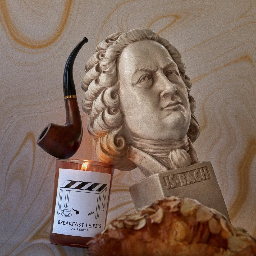Breakfast at Café Zimmerman, where Bach wrote his famous Java Cantata in the 1700s. Imagine tightly packed tables of people breakfasting over buttery almond pastries and strong coffee. Smoking pipes, reading newspapers, talking. Creamers of milk, kitchen steam, tobacco clouds, a hint of an old fireplace in the corner, and burgundy leather upholstery on the seats. A light-hearted gourmand candle.